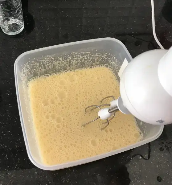 İlk olarak malzemelerimizi dolaptan çıkarıp oda sıcaklığına gelmesini bekliyoruz ki daha puf ve yumuşak kekimiz olsun. Sonrasında yumurta ve şekeri iyice köpürene kadar çırpıyoruz.