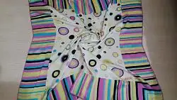 4.Kenarları puantiyeli ortası çizgili içerisinde yine birçok renk bulunan her kıyafete kombinelenebilen sura ipek eşarbım yine %100 ipek ama iç yüzünde terlemeden falan oluşan lekelenmeler var takıldığında hiç belli olmuyor yıkandı temiz ama bi kaç yerde hafif lekelr olduğundan 10 TL (kullanmaya kesinlikle engel değil yinede bilinsin diye yazıyorum )