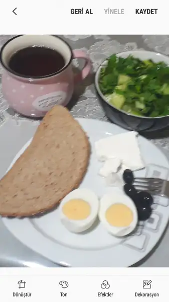 2 dilim ekmek ile tavada yumurta az labne 2 dilim köy peyniri zeytin, domates salatalık ve sivri biber