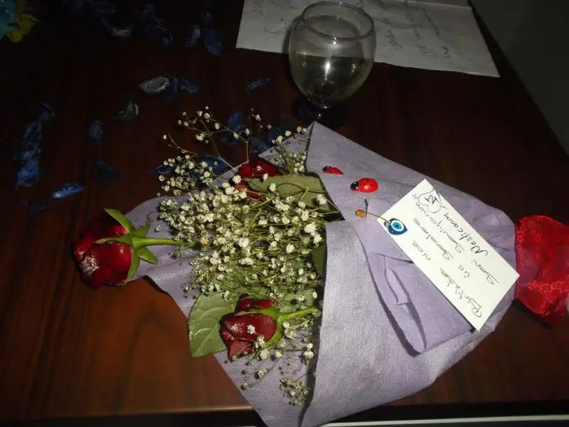 dün malum evlilik yıldönümümüzdü,işten öğleden sonra izin alıp eve gittim,giyinip güya yemeğe çıkacaktık ama kocacımm erkenden kalkıp bi sürü hazırlık yapmış,mavi güller,kırmızı güller,ben içeri girer girmez müzikler falan her şey çok ama çokkk romantikti