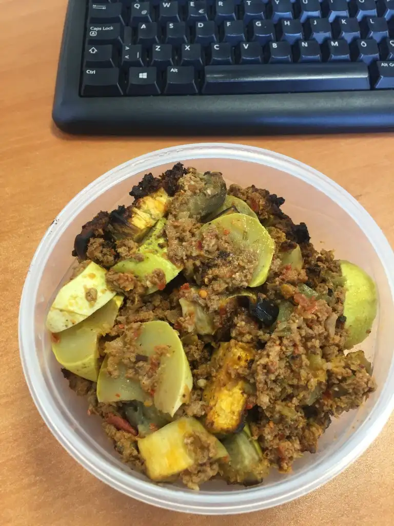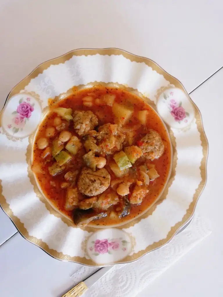 Bu buyuk tencerede 2 patlıcan 5 kabak 1 sogan 1 domates rendesi 1 yemek kasıgı biber salcası 2 su bardağı nohut 1 havuc 250 gr kıyma kuru nane karabiber tuz pul biber zeytinyağı var ustunu gececek kadar su kısık ateste agır agır yarım saat pişti hepsi bu piştikten sonra