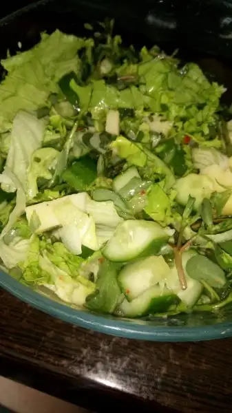 Semizotu, orta boy haşlanmış pattis, kıvırcık ve salatalıklı salata bir de yarım bardak kefir. Öğle yemeği yapıyorum bunu. Semizotumu da kendim yetiştiriyorum. :)))999