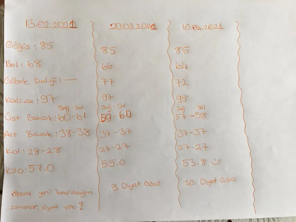 30 günlük diyet ve egzersizle ben çok güzel sonuç aldığımı düşünüyorum bel, karın, sağ-sol bacak, sağ-sol kol toplamda 21cm incelmişim 1aylık sonuçta bu çok güzel bir sonuç benim için tartıda -3.200gram gördüm 53 kiloya düştüm ama sanırım incelme benim için daha önemli mutluyum 🤍🤍💐