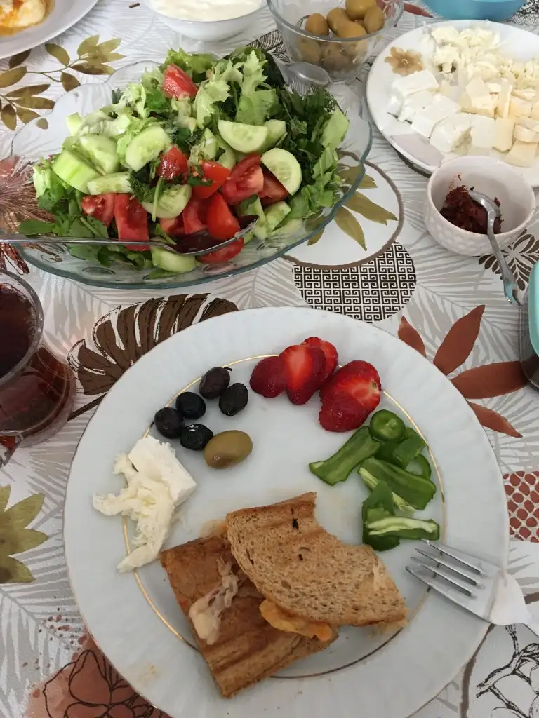 13.00kahvaltı hindi fümeli süzme peynirli tam buğday ekmeğinden tost, 5 siyah zeytin(az tuzlu artık), 1 yeşil zeytin, 2 çilek, peynir, yeşil biber ve sövüş, şekersiz çay