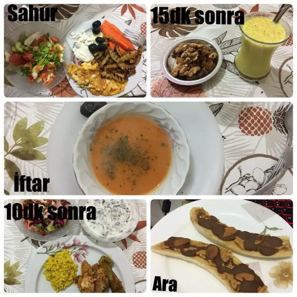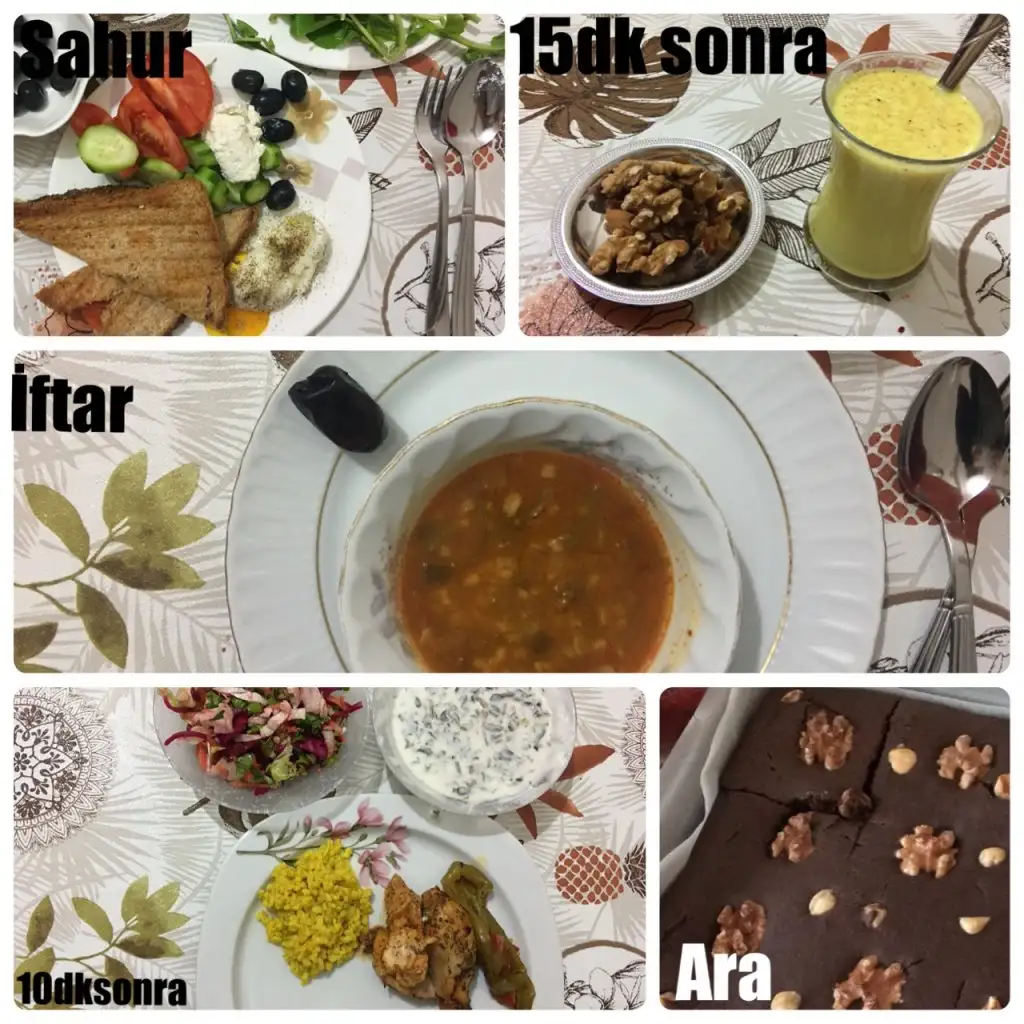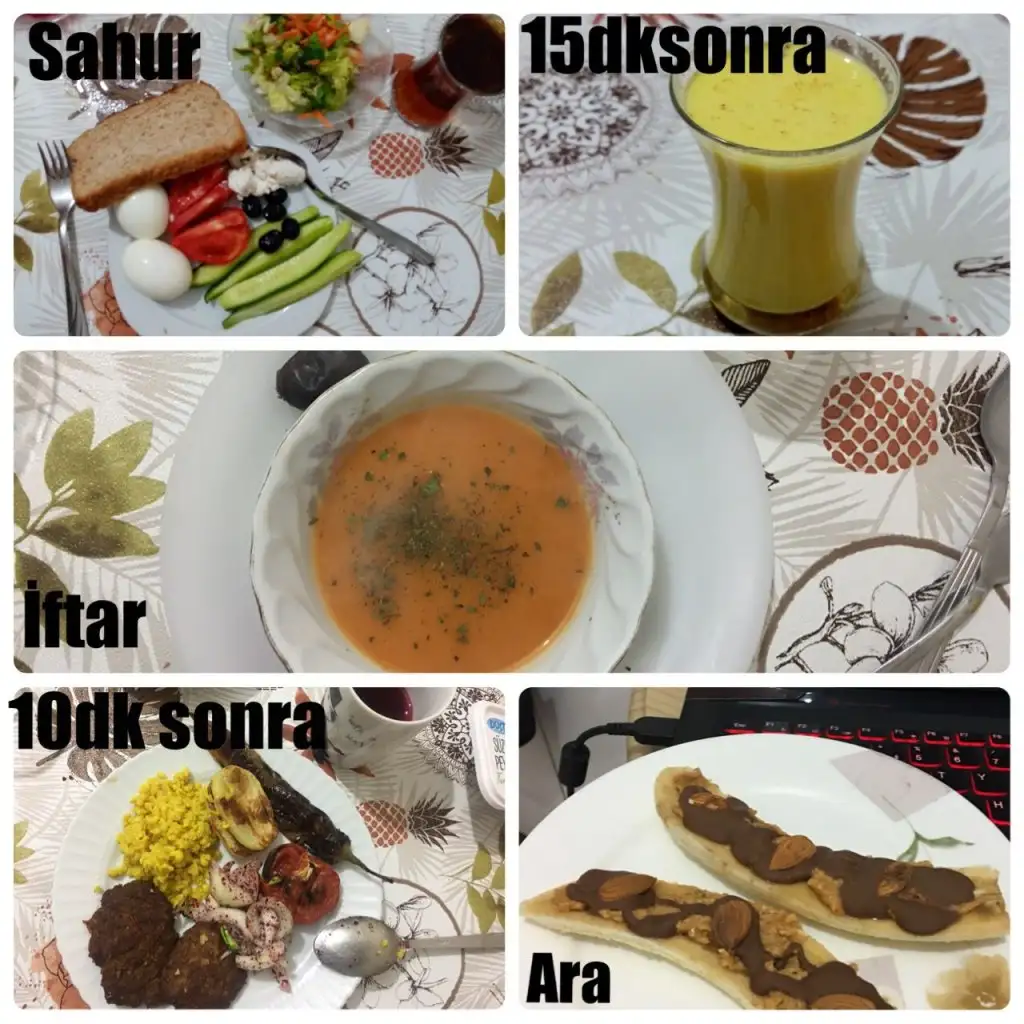 Sahur: 1 tambuğday ekmeğine tost (İçine süzme peynir,acuka ve yarım hindi füme et), 1haşlanmış yumurta, 1ceviz, 5siyah zeytin, 1yeşil zeytin, 1biber,1salatalık,yarım domates,yeşillik ve yeşil çay