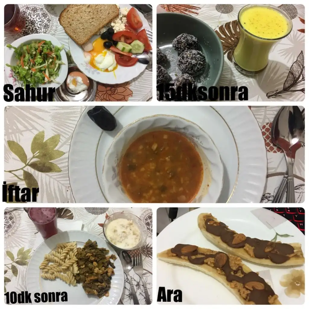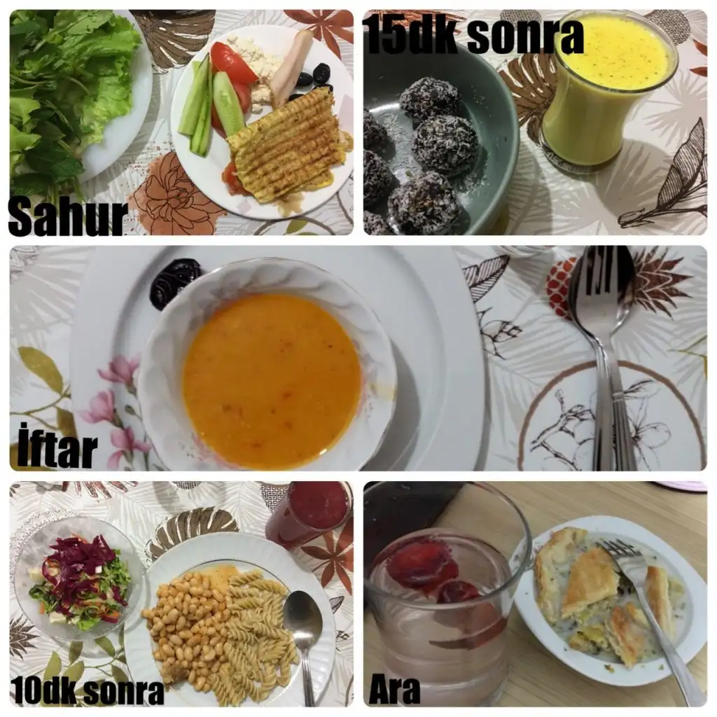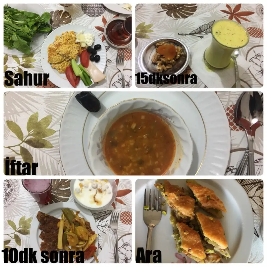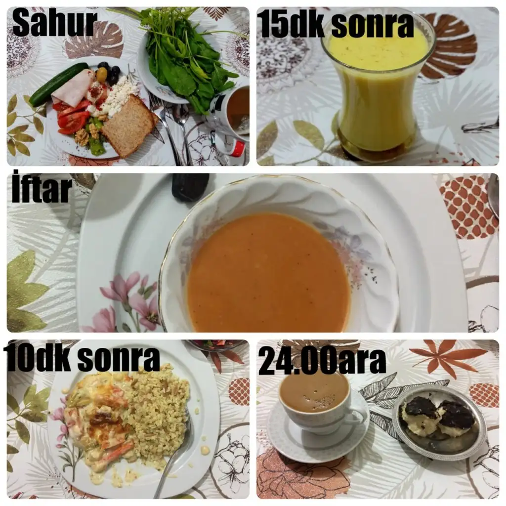 Sahur: 1 tambuğday ekmeğine tost (İçine süzme peynir,acuka ve yarım hindi füme et), 1haşlanmış yumurta, 1ceviz, 5siyah zeytin, 1yeşil zeytin, 1biber,1salatalık,yarım domates,yeşillik ve yeşil çay