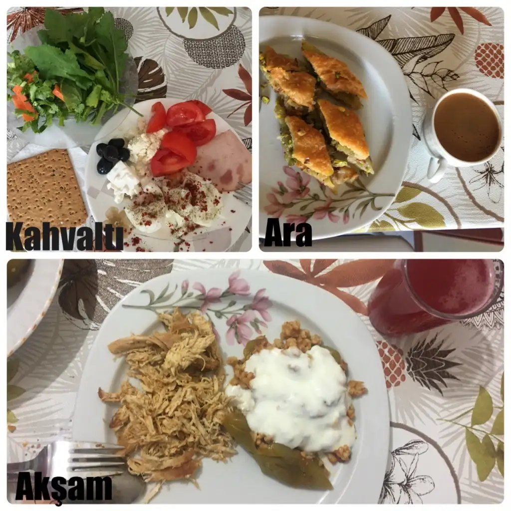 Sahur:Yulaflı tost, içine ince 1 dilim kaşar, 1 hindi füme salam, 1yk lor peyniri, 5siyah zeytin, yeşillik-domates-roka, 1çb şekersiz çay