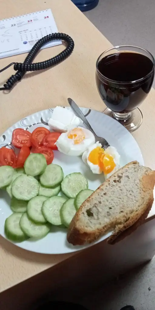 Kahvaltı zamanı iki tane haşlanmış yumurta salata , çeri domates 3 tane beyaz peynir bir dilim kepek ekmeği sıkılmış nar suyu