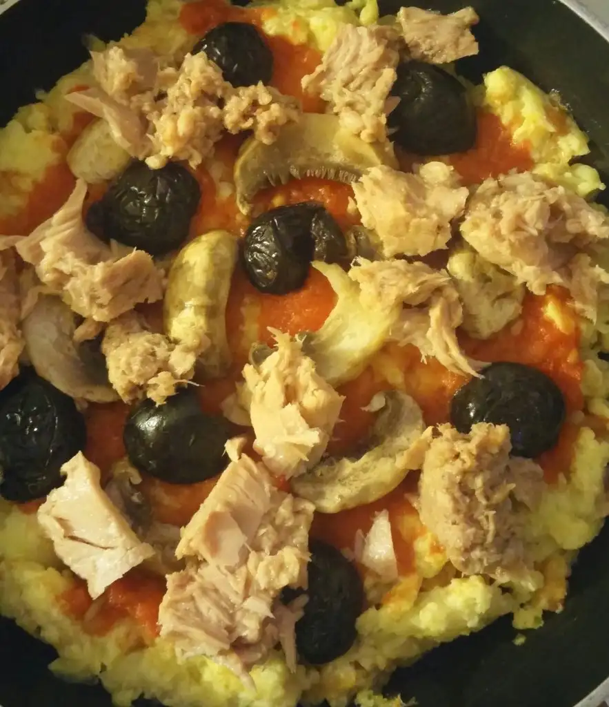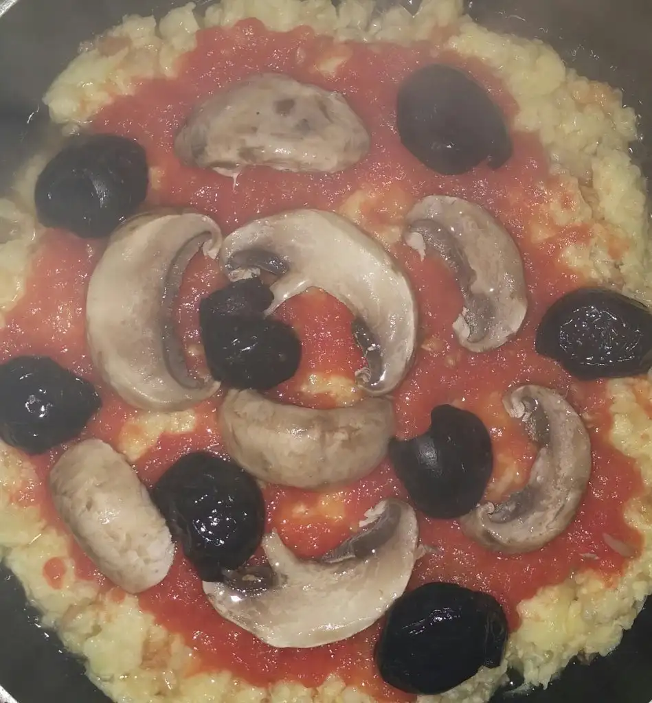 Annemin ev yapımı domates püresinden 2 yk, 1 mantar ve 4 zeytin ilavesi. Üzerine kapak kapatarak mantarların pişmesini sağladım biraz.