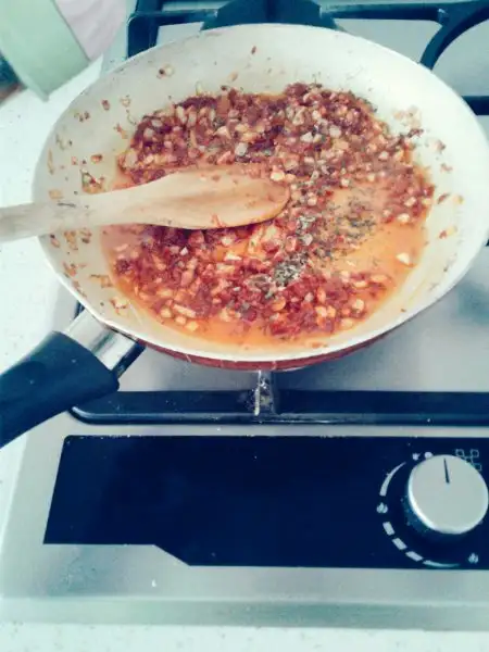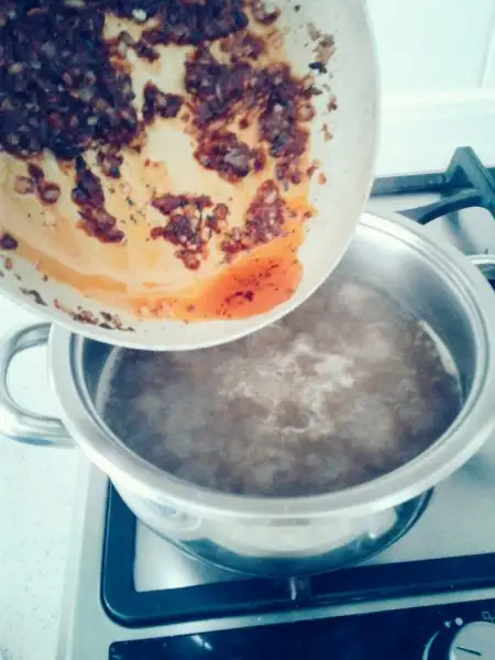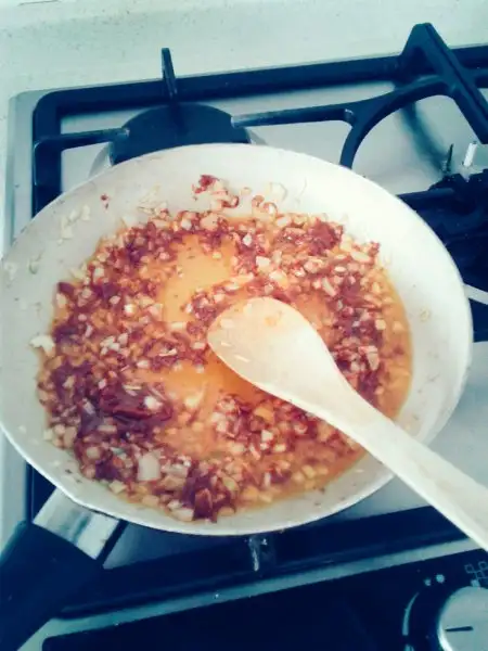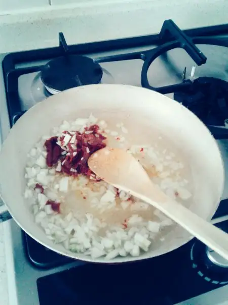 once 4 bardak su ile yeşil mercimek bir tencerede iyice haslanirken ortaboy soğan yag salca iyice kavrulur