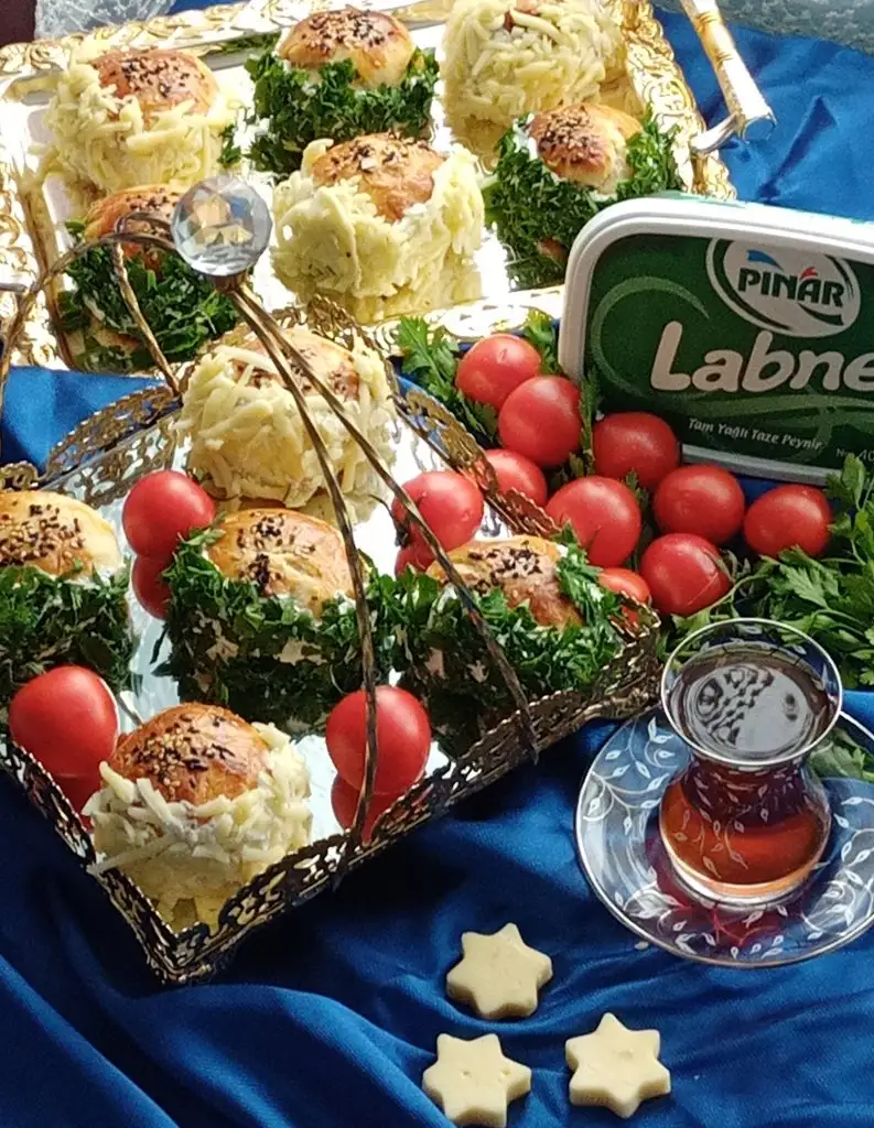 Kızaran pogacalarimizi ikiye ayırıp içine ve dışına labne sürelim ve maydanoz ve kaşara bulayıp servise başlayalım.
