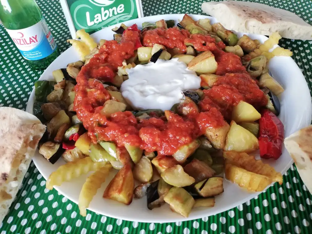 -Fazla yağı alınsın diye kağıt havlu üzerine alınan kızartma, kağıdı alınıp harmanlanır, ortası açılır. İçine isteğe bağlı 1 diş sarımsak ve 1 kaşık labne eklenen yoğurt dökülür.