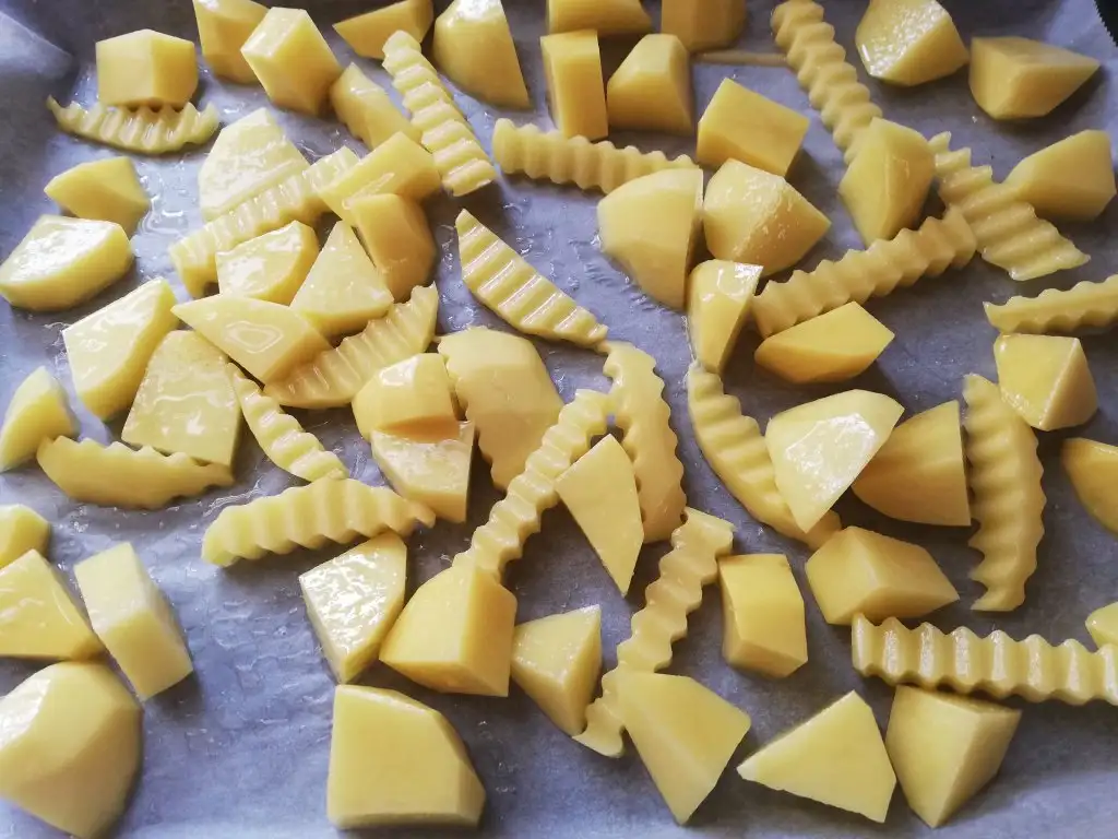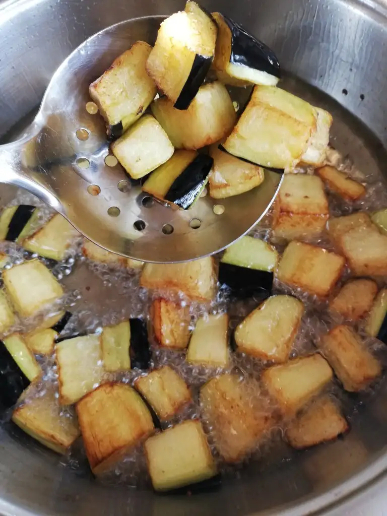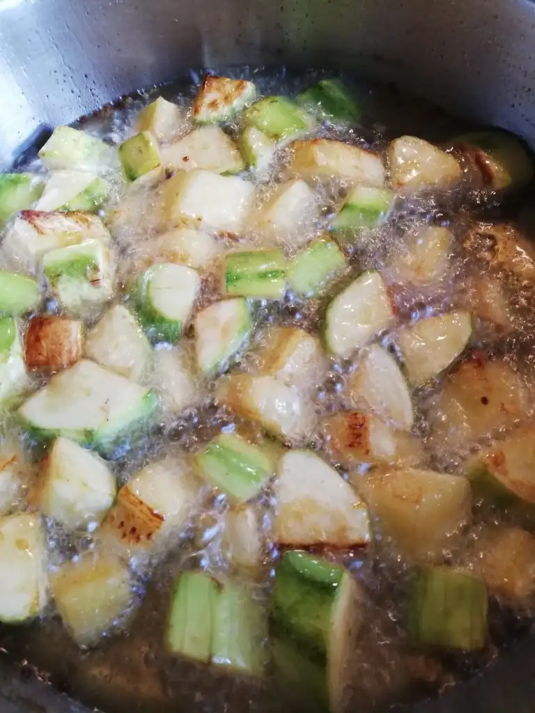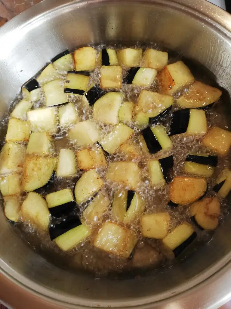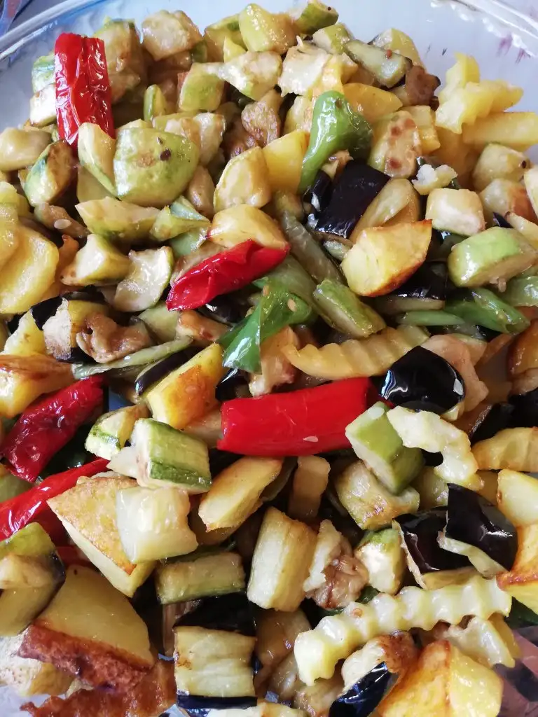 -Daha sonra kızartma tavamıza koyduğumuz yağ kızdırılır ve sırasıyla sebzeler kızartılır.Peçete veya kağıt havlu ile fazla yağı alınır. Ben patatesin üstüne tuz ve sıvıyağ ekleyip ,karıştırdım. Fırın tepsisine pişirme kağıdı serip fırında kızarttım patatesi. Patates kızarana kadar da tavada, patlıcan, kabak ve biberi kızarttım.