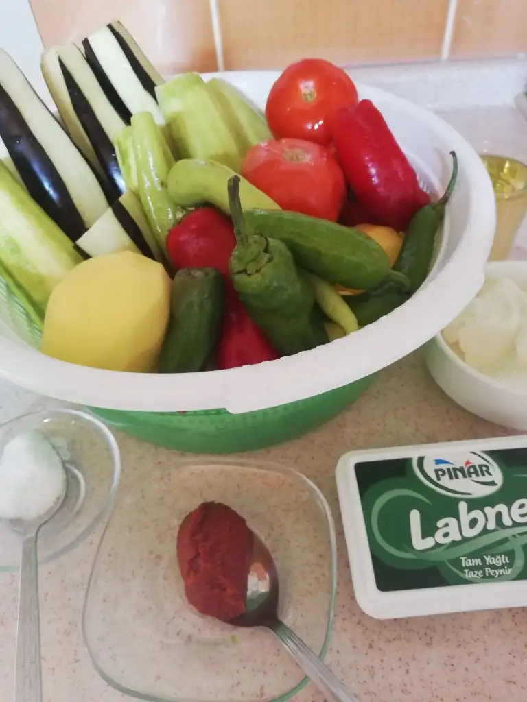 -İlk önce sebzeler yıkanır, doğranır, patlıcan acı suyu çıkması için tuzlu suya konulup bekletilir, diğer sebzeler de suyu süzülünce kurulanıp küp küp doğranır.