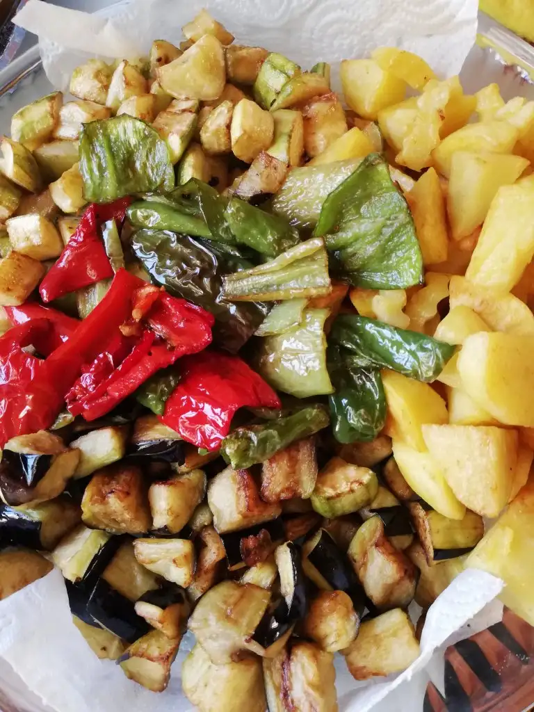 -Daha sonra kızartma tavamıza koyduğumuz yağ kızdırılır ve sırasıyla sebzeler kızartılır.Peçete veya kağıt havlu ile fazla yağı alınır. Ben patatesin üstüne tuz ve sıvıyağ ekleyip ,karıştırdım. Fırın tepsisine pişirme kağıdı serip fırında kızarttım patatesi. Patates kızarana kadar da tavada, patlıcan, kabak ve biberi kızarttım.