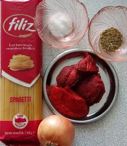 1 paket makarna 1 orta boy soğan 1 yemek kaşığı biber salçası 2 yemek kaşığı domates salçası tuz,kekik ,istediğiniz baharatlar haslamak için su