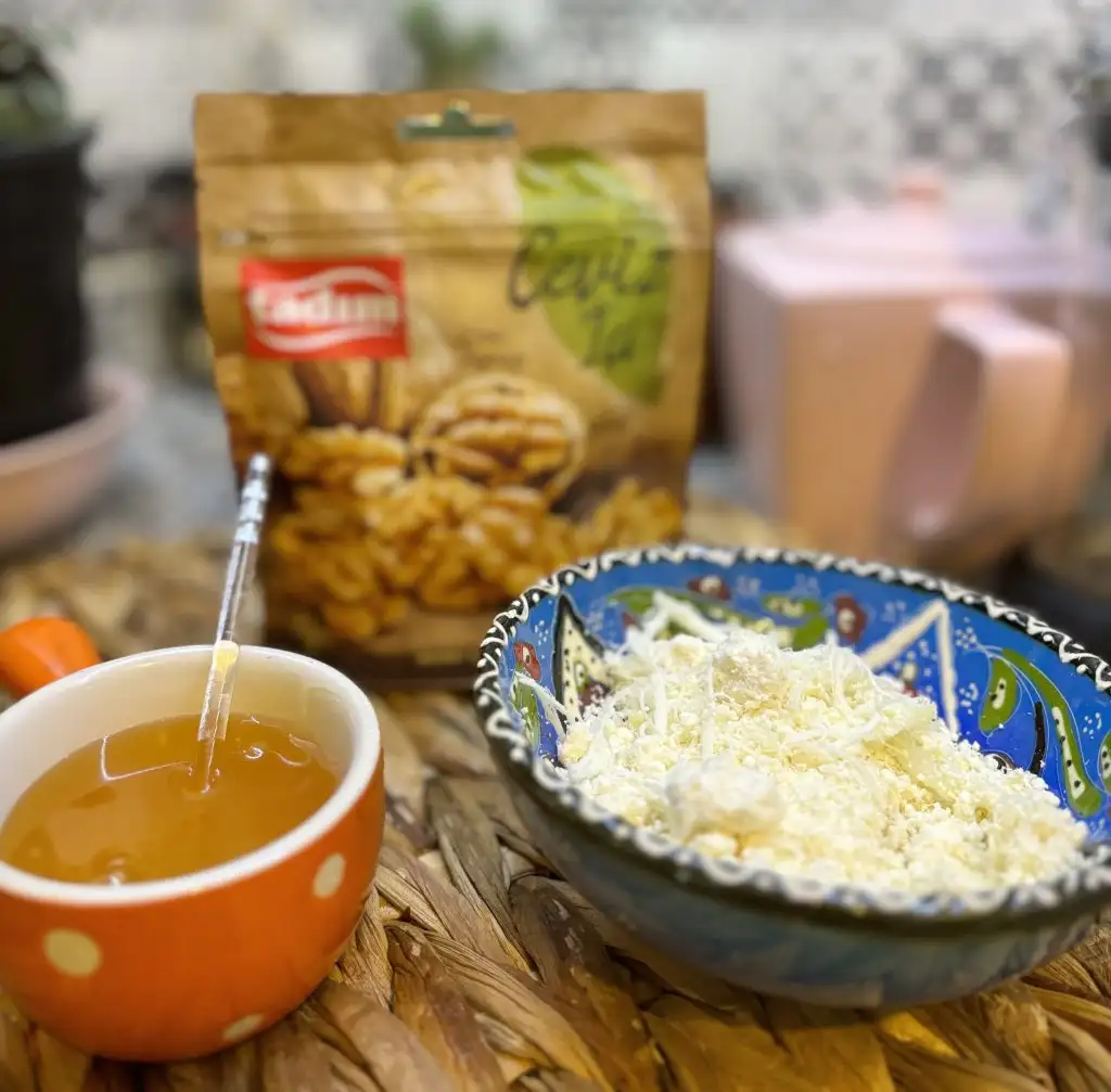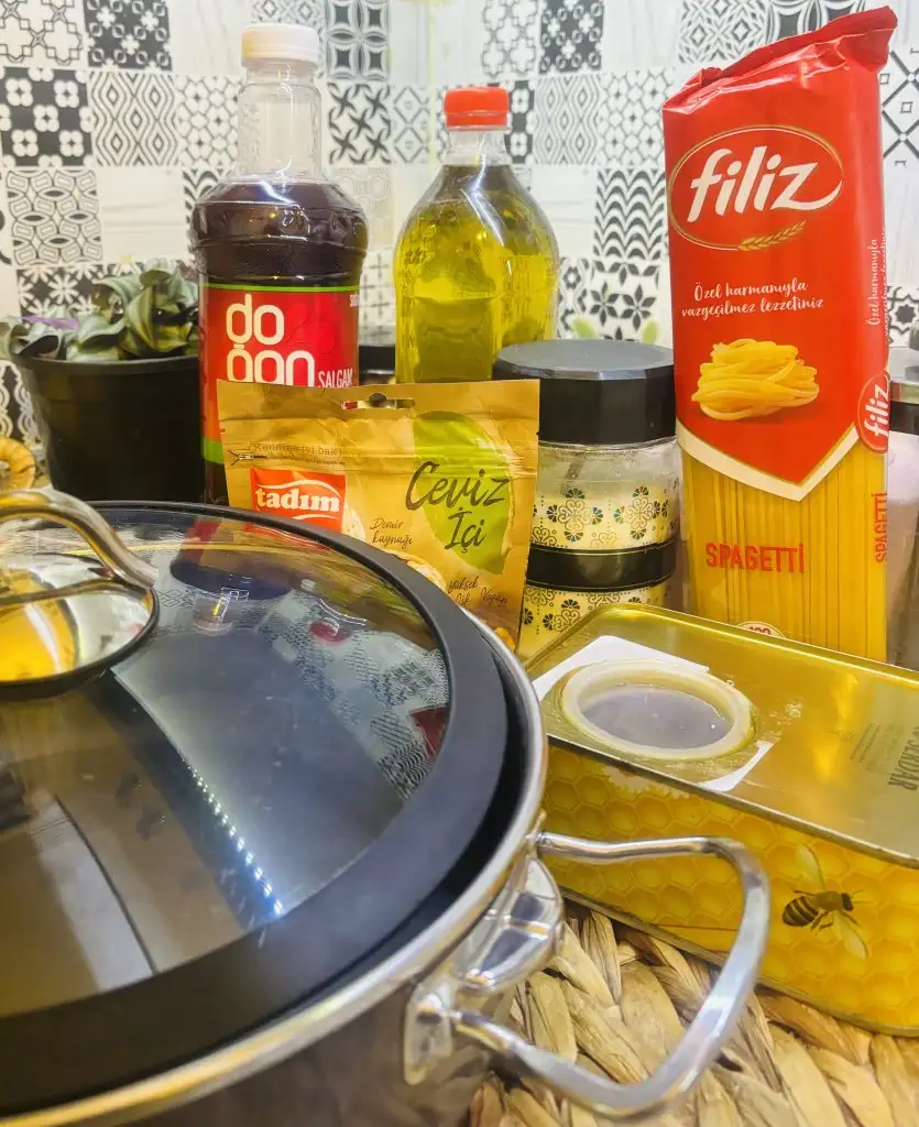 Pişen spagettilerimizi servis etmeden önce üzerine lor ,peyniri ,bal ve ceviz ilave ediyoruz.