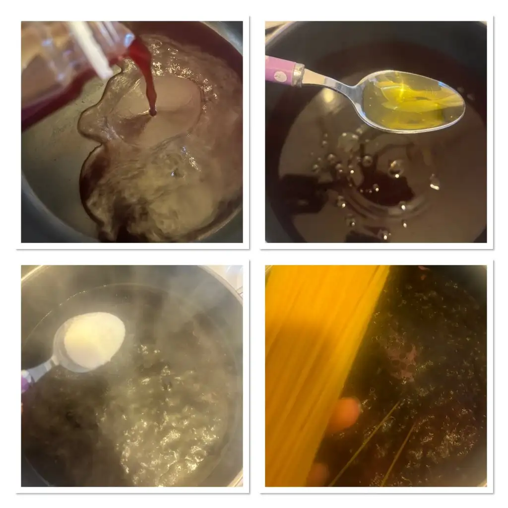 Şalgam suyunuzu ve üç yemek kaşığı kadar zeytinyağımızı tenceremize koyup kaynamaya bırakıyoruz.Kaynayan suyumuza önce tuzumuzu sonra spagettilerimizi ekleyip ,makarnamızı haşlıyoruz.