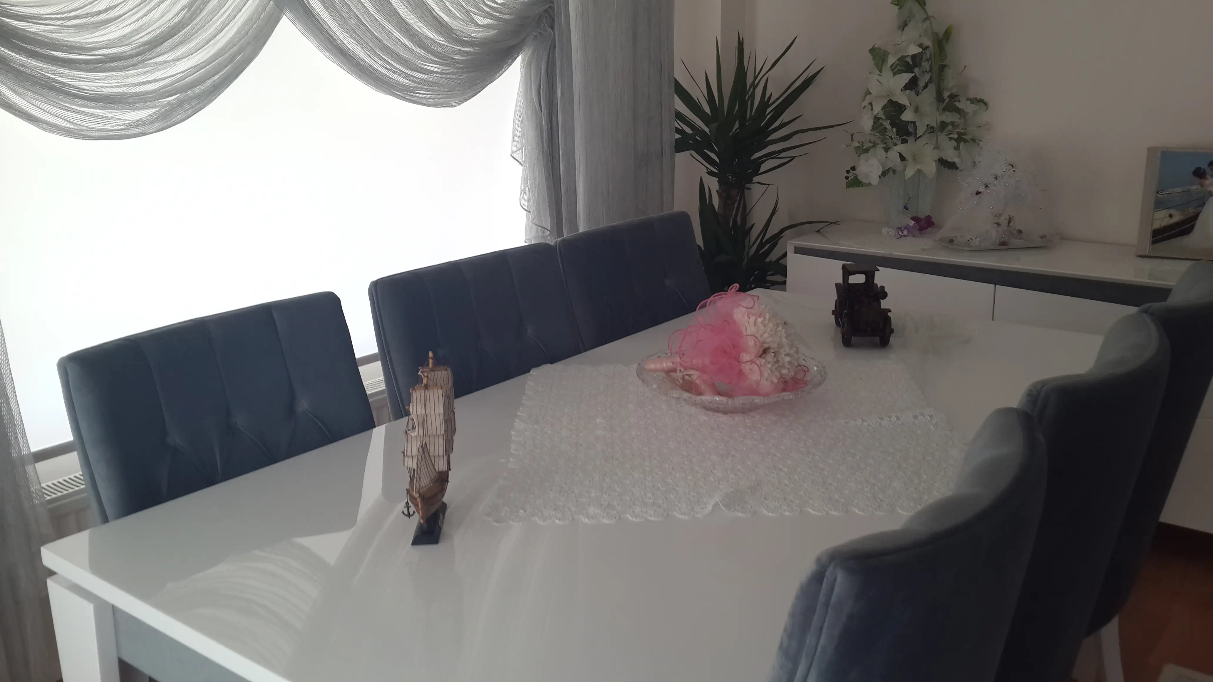 Bir de ufak bir tavsiye, danteller yakışmamış. Hem beyaz mobilyanın üstünde güzel durmamış hem de salonun modern havasına uymamış. Renkli örtüler kullanabilirsiniz onların yerine.
