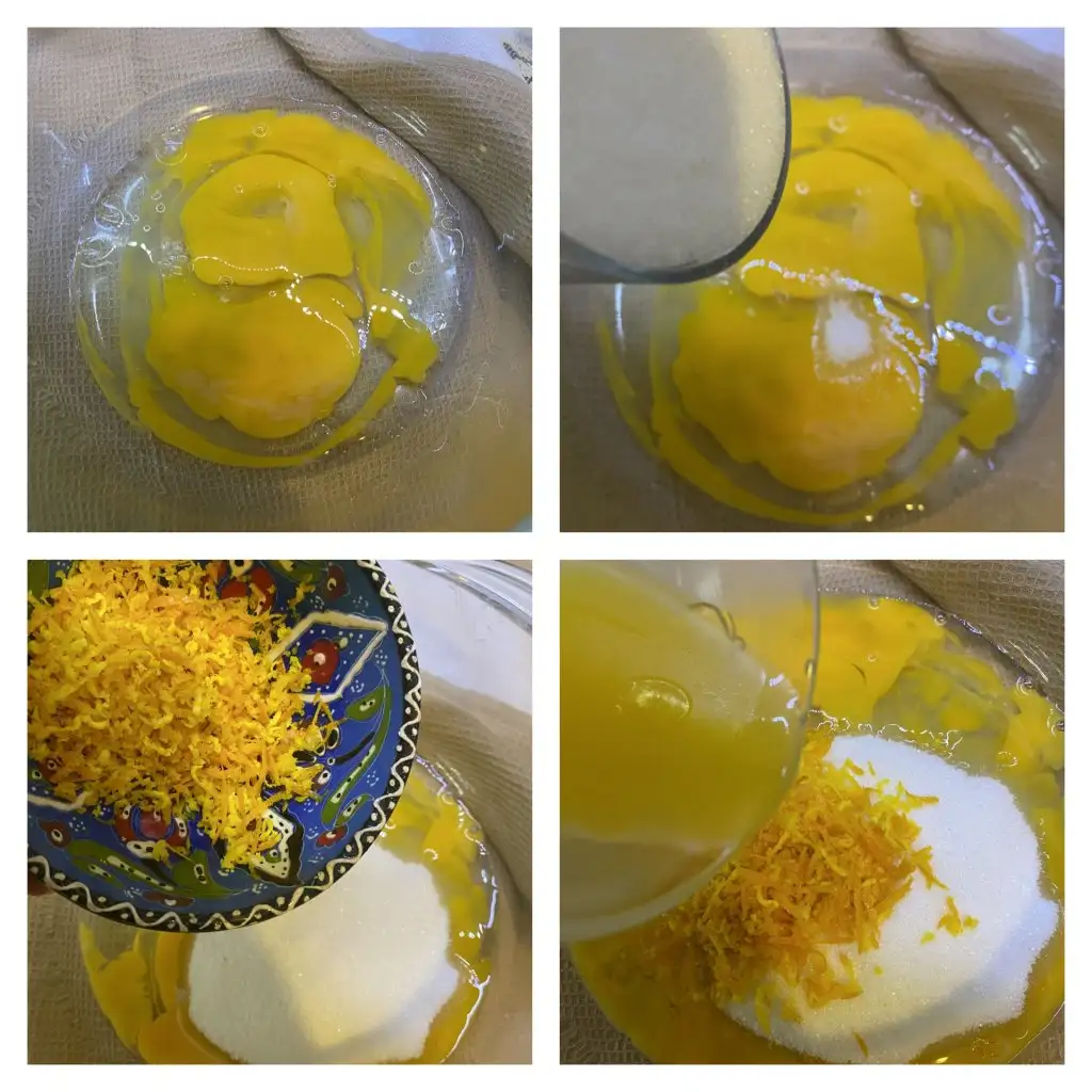 Hamurumuzu yoğuracağımız kaba ilk olarak yumurtalarımızı,şekeri,portakal suyunu ve kabuklarını ekleyip karıştırıyoruz.