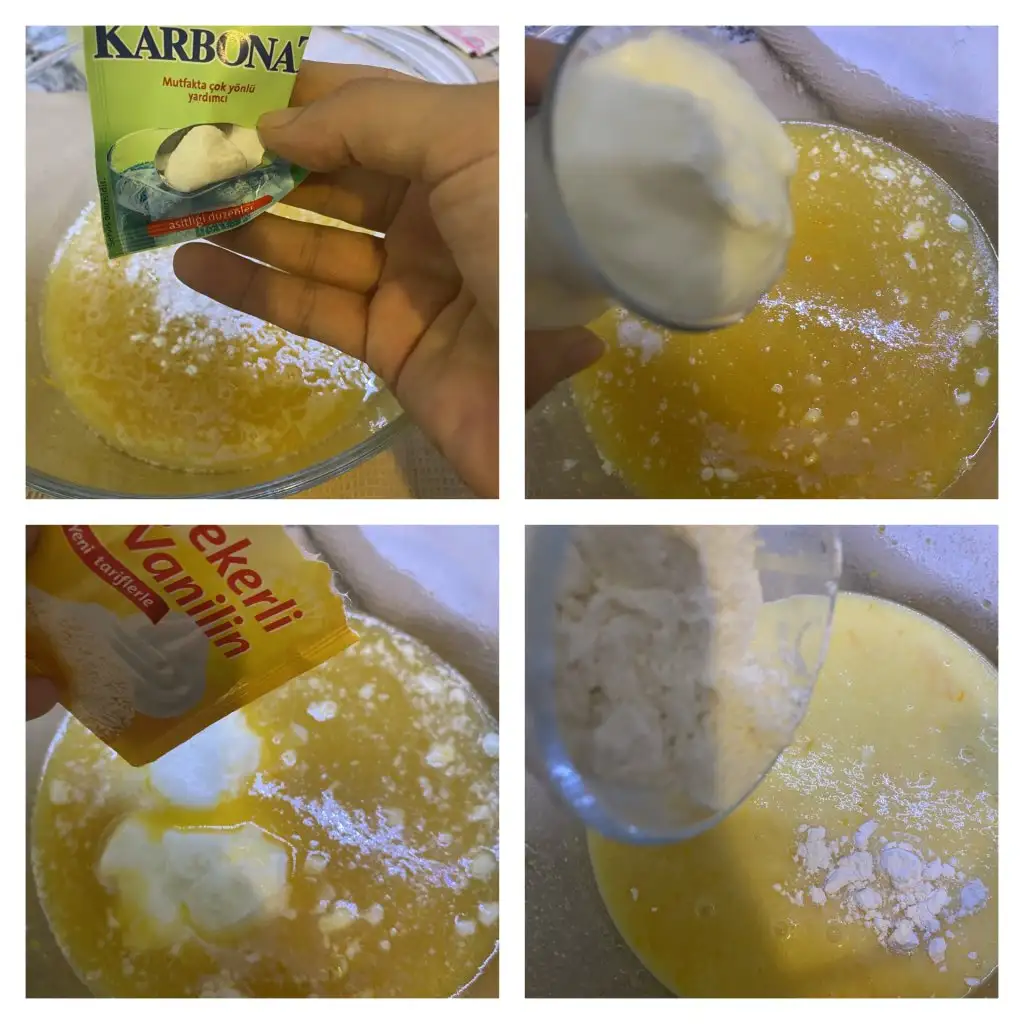 Daha sonra yoğurt ,yağları,kabartma tozu ,karbonat ve vanilini ekleyip karıştırıp son olarak kontrollü olarak ele yapışacak bir hamur elde edecek şekilde unumuzu ekliyip ,yoğuruyoruz.