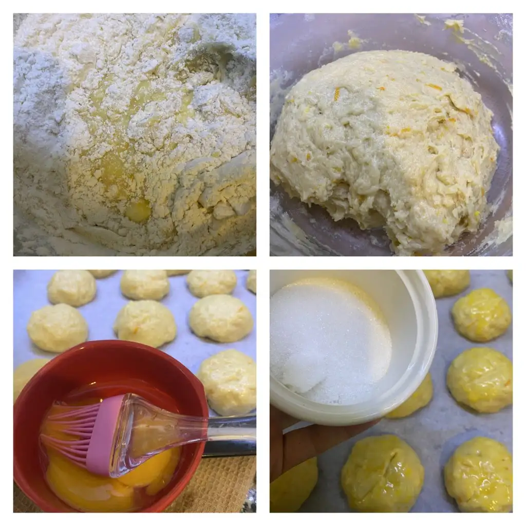 Üzerlerine yumurta sarısı sürüp dilerseniz bıçakla çentikler atabilir (kendisi çatlıyor güzel pişince ama riske atmak istemiyorum derseniz )üstüne toz şeker serpip önceden ısıtılmış 180 derecelik fırına verebilir,üzeri kızarana kadar pişirebilirsiniz.