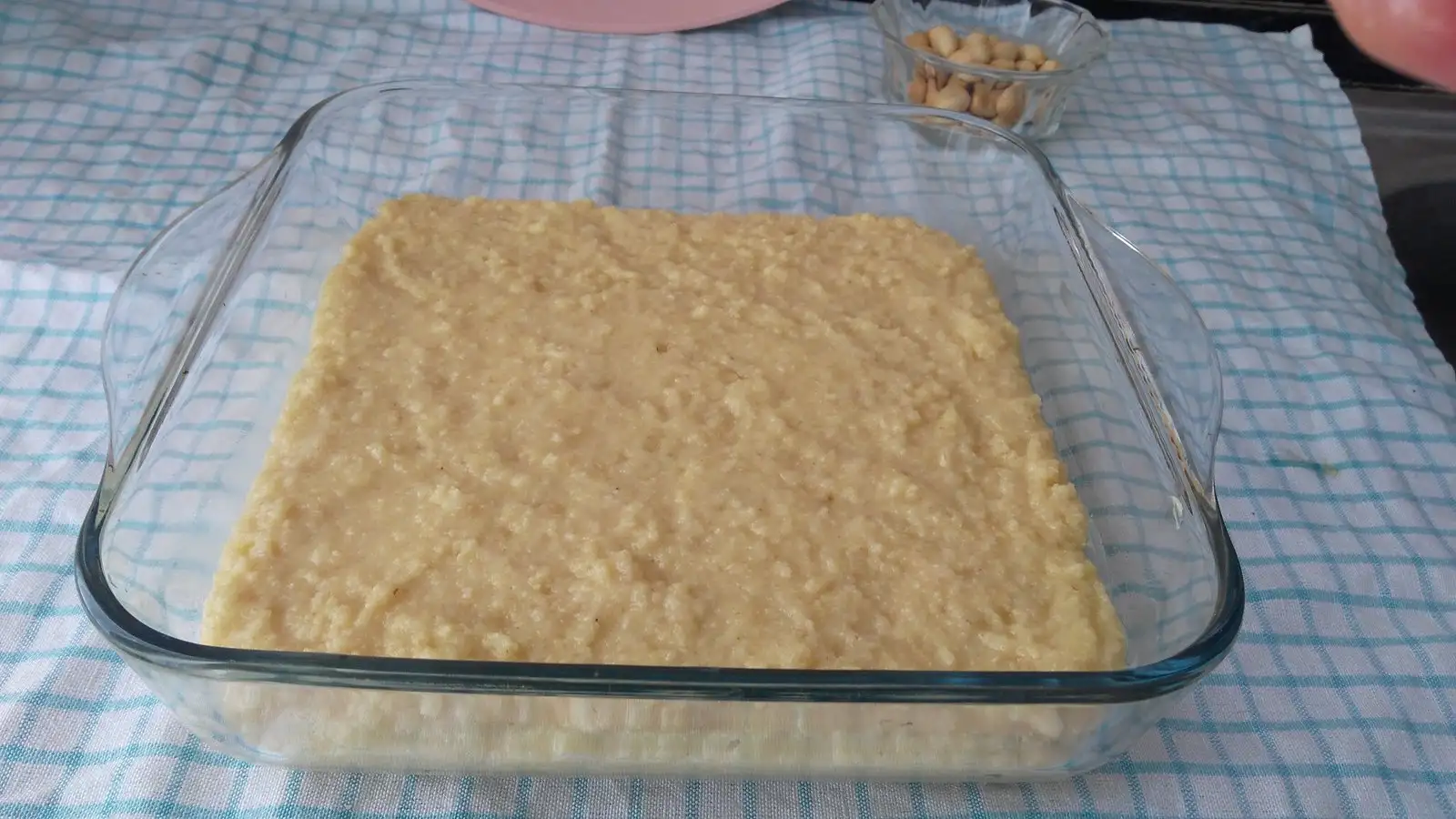 Hamuru için kuru malzemeleri bir kapta karıştıralım. Üzerine süt ve yoğurdu ekleyerek elimizle yoğuralım, cıvık bir hamur olacak. Yağlanmış küçük boy kare borcama harcımızı yayalım, elimizle bastırarak düzeltelim. Tepsimizi streçleyip buzdolabında 2 saat kadar irmiklerin şişmesi için bekletelim.