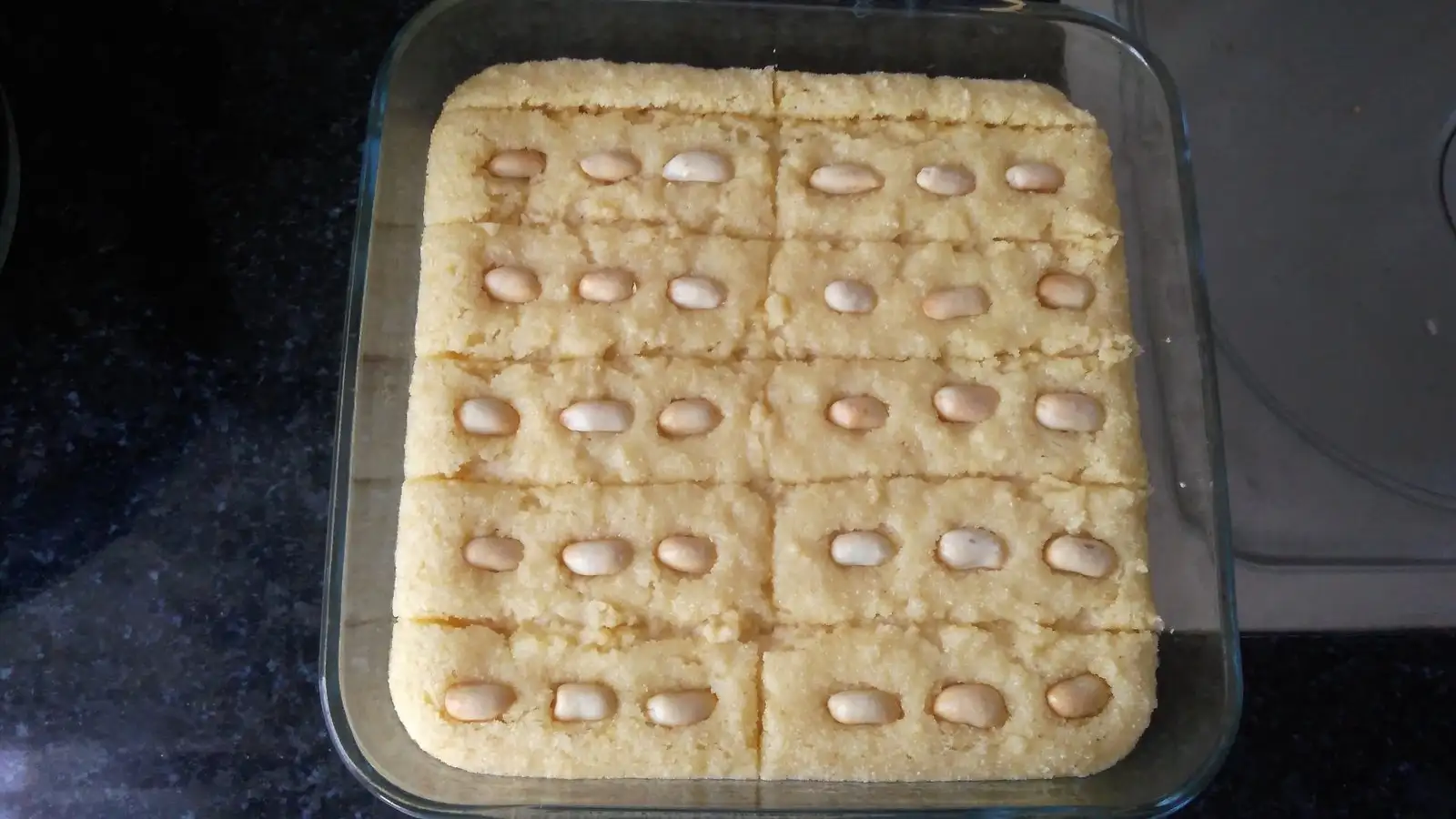 Dinlenen harcımızı 180 derecede önceden ısıtılmış fırınımıza atalım. 15 dakika pişirdikten sonra çıkarıp klasik şambali şeklinde dilimleyim ve üzerine fıstıklarımızı dizelim. Tekrar fırına atıp 15-20