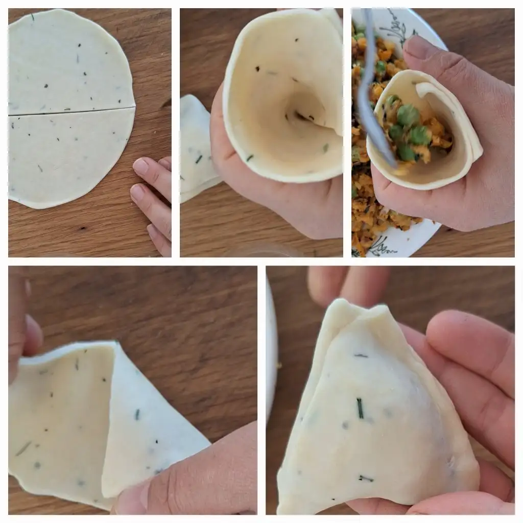 Açtığımız hamuru ikiye kesip honi şekline getirip iç harcını koyup üçgen şeklinde kapatıyoruz