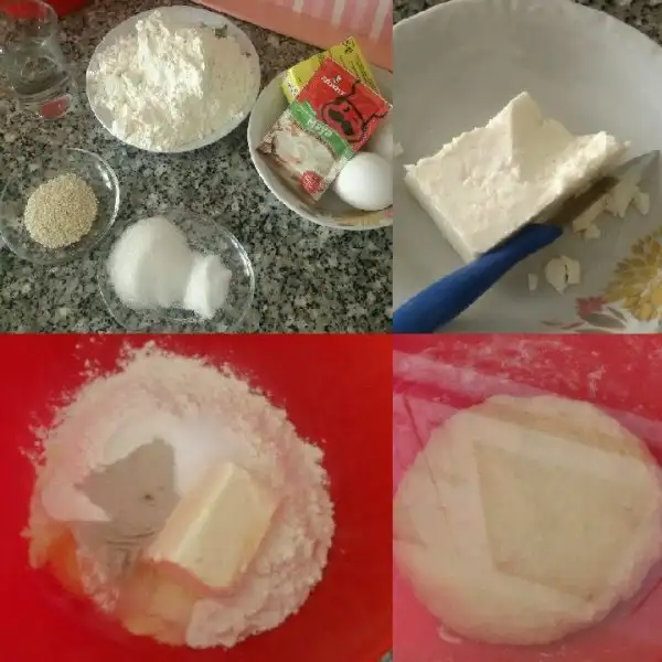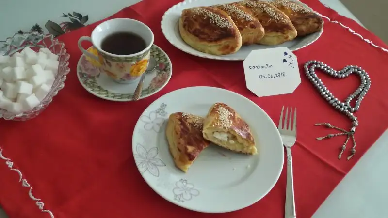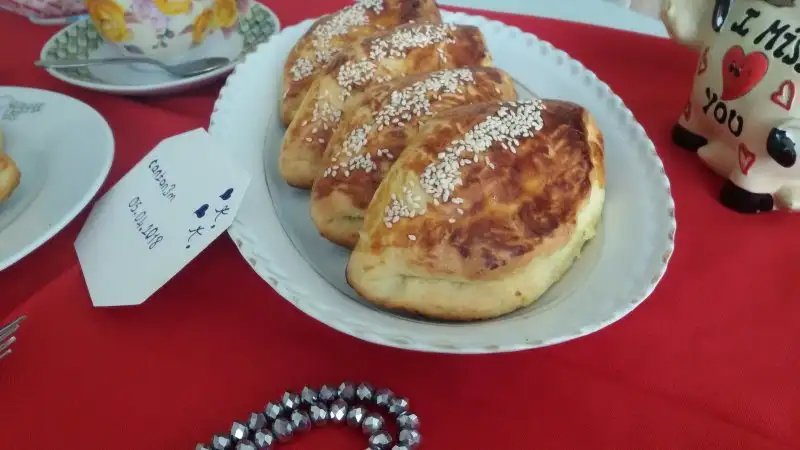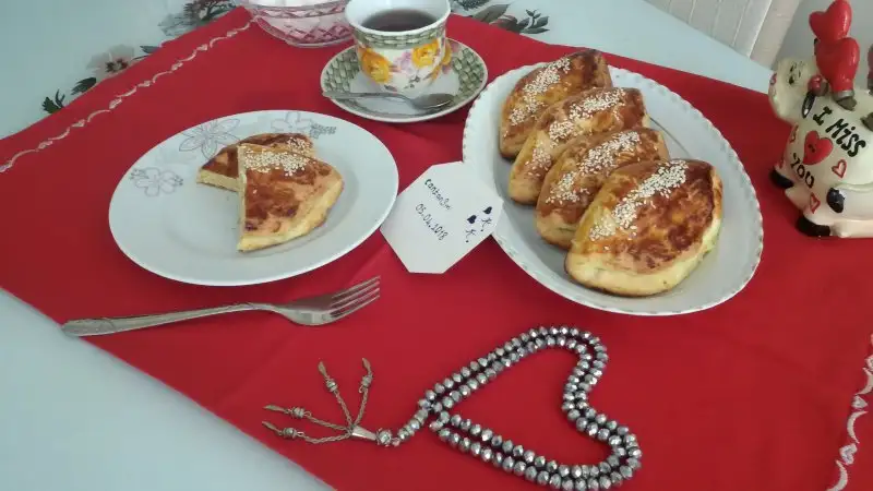 Mayalanınca tezgahın üzerine un serpip yoguruyoruz. Mandalina kadar koparıp bezelere ayırıyoruz. (Ben 9 beze elde ettim) Tezgahın üzerinde parmaklarımızla açıp genisletiyoruz. Ortasına peynir koyup kapiyoruz, ortasından elimizi yan şekilde tutup bastırıyoruz.