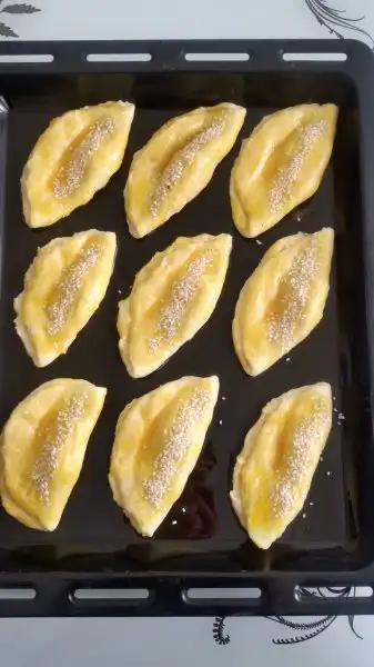 Üzerine pudra şekeri ekledigimiz yumurta sarısını suruyoruz. Susam serpip 30 dk tepsi de mayalanmasını bekliyoruz. 180 derecelik önceden ısıtılmış fırında üzeri kizarana kadar pisiriyoruz.
