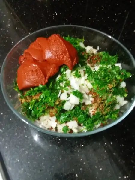 Yaprak sarmamızı hazırlamak için ilk olarak salamura yapraklarımızı 4-5 dakika kadar sıcak suda bekletmeliyiz. Salamura çok tuzlu olduğu için sıcak su ile tuzu attırılır ve daha sonra süzülerek bol su ile yıkanır. Geniş bir karıştırma kabına kuru soğanlarımızı incecik doğrayalım. İsteğe göre rende de yapılabilir. Kuru soğanın üzerine zeytinyagı, baharatlar, salça, tuz ve incecik kıyılmış maydanoz ilave edelim. Ardından bol su ile yıkadığımız pirinci iyice süzerek karışıma ilave edelim ve homojen bir şekilde karıştıralım. (yaprak sarmamızı çiğ harçtan hazırlayacağız.)