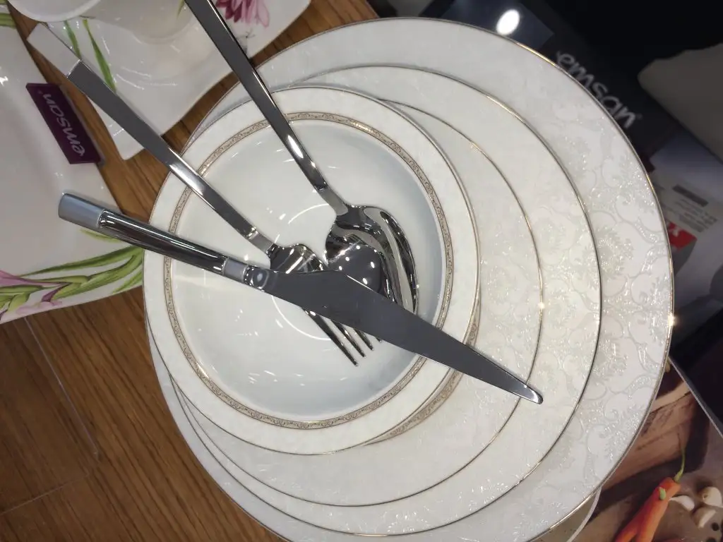 tabiki de yıkanıyo. 5 yıl garantisi var. yıkama kırılma vesaire vesaire. ama yine de ben de silinmesinden korktuğum için kabartmalı bi takım aldım. altın detayları var çok az. fırınlanma yöntemi kullanıyormuş zaten o da kolay kolay çıkmazmış. hatta bak şöyle tam olarak çatal kaşık takımlarımla birlikte.