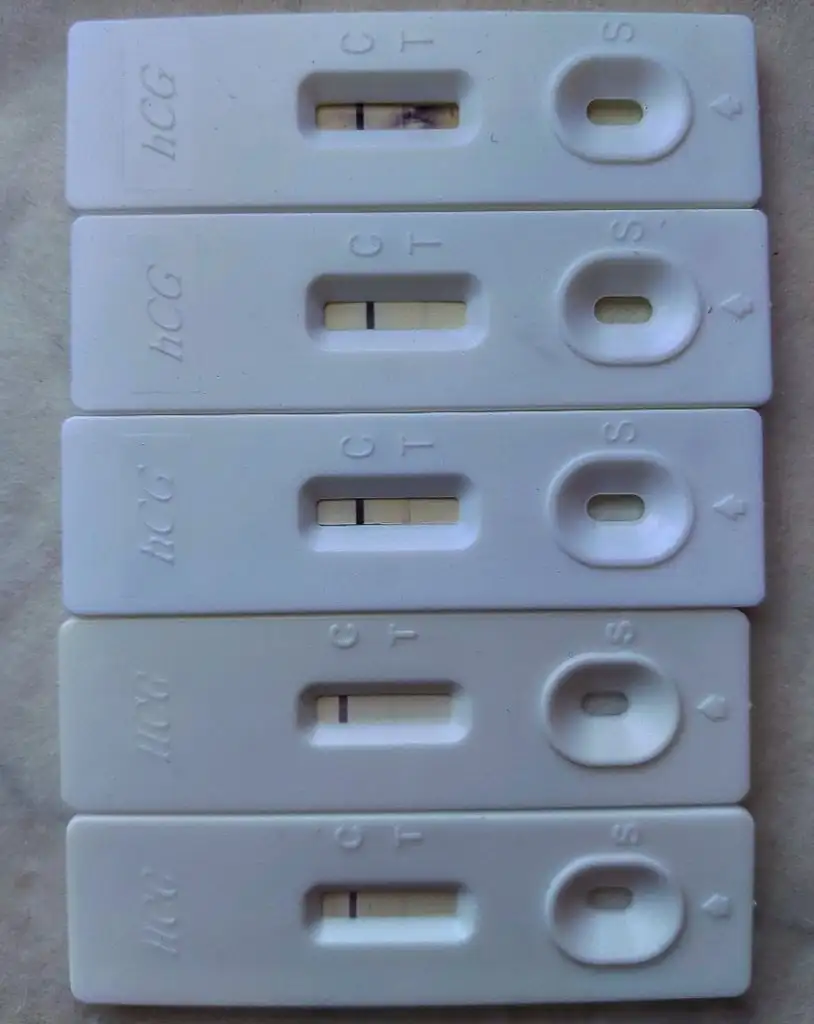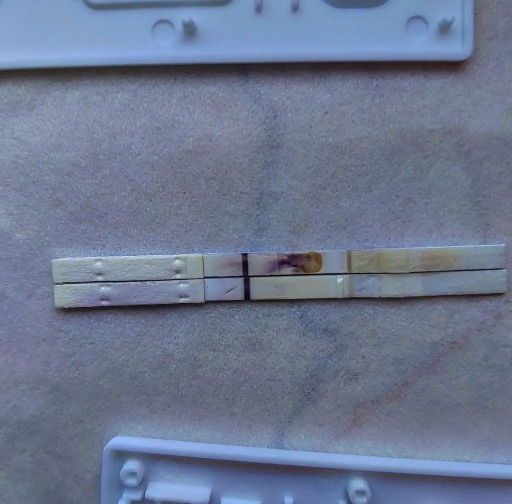 canim ben adet olmadim daha. dun test yapdim. neqativdi. fakat testden once elim islakdi islanmisdi cizgi yerleri. testi yapdim neqativ oldu. oylesine merak etdim icini acdim basina dogru kirmizi yayilmisdi. icime şuphe duşdu islandigindan dolayi. 1ini daha yapdim. kirmizisi yayildi pek bisey anlasilmadi fakat sonucu neqativ diye algiladim. eşim sabah testlere bakdi, bak beni kandirmişsin neqativ diye hani burda zayif ikinci cizgi var dedi. bakdim gozle gorulur 2ci cizgi var. fakat yapdigimda yoktu goremedim. 5dakika sonra test gecersiz diye pek aldirmamaya calisiyorum. fakat buraya resminide aticam (resim kailtesi keskinlesdirildi, kameraya goz kadar iyi cikmadigi icin).10 12saat sonra boyle cizgi gorub hamile olan var mi? ovu.dan 26gun, batdan 1gun gecdi.