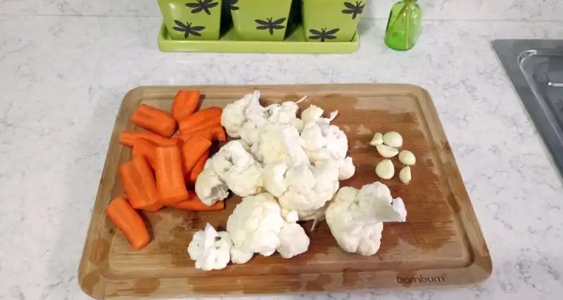Karnabahar ve havuçları iyice yıkayıp, iri iri doğruyoruz, sarımsakların da kabuklarını soyup bütün bırakıyoruz.