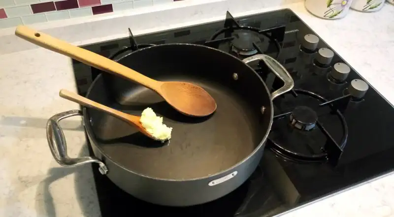 Bir buçuk - iki tatlı kaşığı kadar tereyağı, yayvan bir tencerede eritiyoruz.