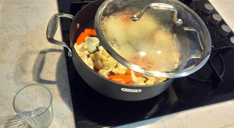 Tereyağı tamamen eriyip kokusunu yayınca, iri doğradığımız karnabahar-havuç ve sarımsakları ilave ediyor, bir tur karıştırıp, üzerine 2 buçuk - 3 bardak kadar sıcak su ilave ediyoruz. Kaynayınca altını kısıp kapağı kapatarak 15 dk kadar kendi halinde pişmeye bırakıyoruz. (Tereyağ kullanıyorum, dilerseniz zeytin yağı da kullanabilirsiniz. Ancak zeytinyağı suya karışmadığı için makarnaların yapışması kaçınılmaz, bu yüzden tereyağı ile başlarsanız suya nüfus edecek ve yapışmayı minimuma indirecektir, püf noktası.