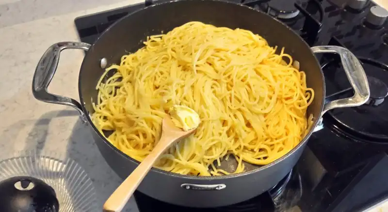 Yaklaşık bir 10 dk kadar böylece suyunu çekti, bir tatlı kaşığı tereyağ ve 2 buçuk - 3 yemek kaşığı kadar zeytinyağı ilave ederek karıştırıp, ocağı kapatıyoruz. İşin makarna kısmı bitti.