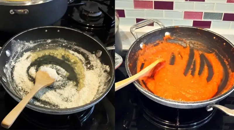 Tepeleme bir yemek kaşığı kadar unu, kokusu çıkana kadar kavuruyoruz ancak çok karartmamaya dikkat edin. Sonra bir yemek kaşığı kadar zeytin yağını ilave edip yağı yedirip, beklemeden, üzerine robotta çektiğimiz domatesi ilave ediyoruz. Damak zevkinize göre tuz, kimyon ve kekik kullanabilirsiniz. (Ben sadece tuz ekledim). Fokur fokur kaynayıp, kıvam alana kadar karıştırıyoruz. Şöyle bir kıvama gelecek işte: