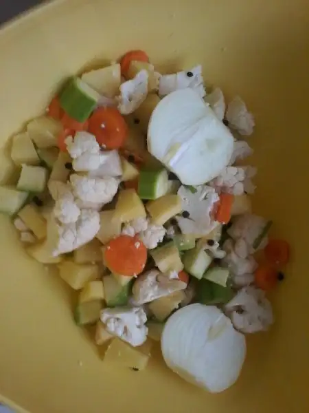 Evet arkadaşlar bütün sebzelerimi küp küp dogradım tane karabiberi ve tuzu ilave edip harmanladım