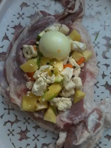 Daha sonra bir tepsiye kuzu sırtımı serip harmanladığım sebzelerin yarısını üstüne koydum