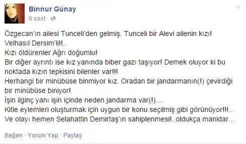 Bu ne ya, özgecanı otobüse arkadaşı bindiememiş miydi, ben çocuğun anlattığını bile hatırlıyorum. Biber gazı da büyük şehirlerde neredeyse her kadının çantasında var.Kendisi evli ama çocuğu var mı bilmiyorum, sadece çocukları varsa onların düştüğü durum ve ailesi için çok üzüldüm. Binnur Günay kimdir?