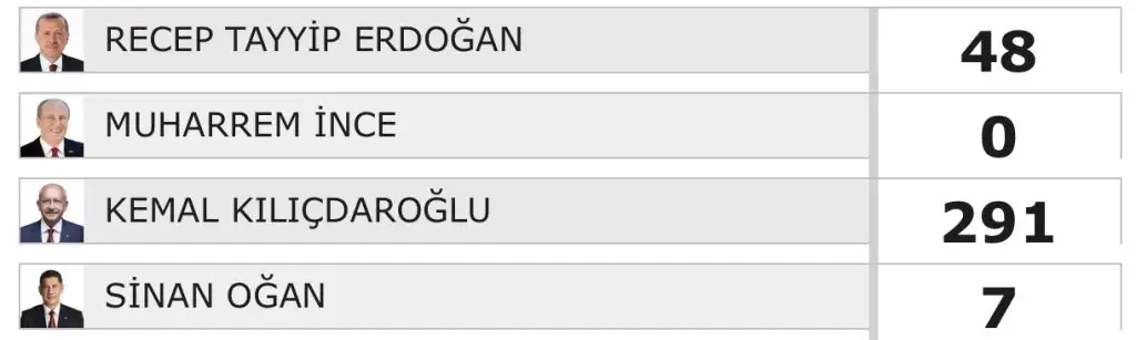 SandığımBenim oy kullandığım sandıktan 177 Kılıçdaroğlu, 141 Erdoğan, 1 İnce ve 21 Oğan çıkmış. Burası muhafazakar bir yer sayılır.