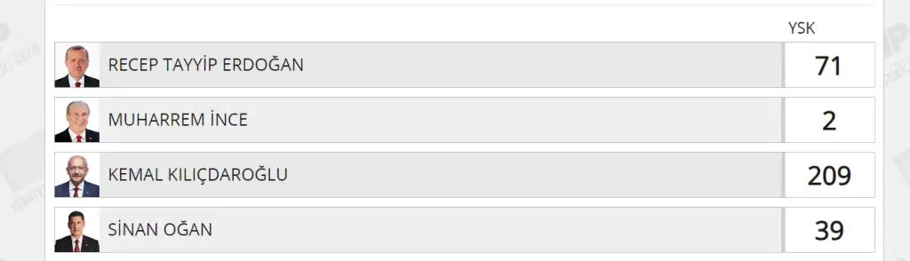 bizim verdiğim okuldan kk önde çıktı..Benim oy kullandığım sandıktan 177 Kılıçdaroğlu, 141 Erdoğan, 1 İnce ve 21 Oğan çıkmış. Burası muhafazakar bir yer sayılır.