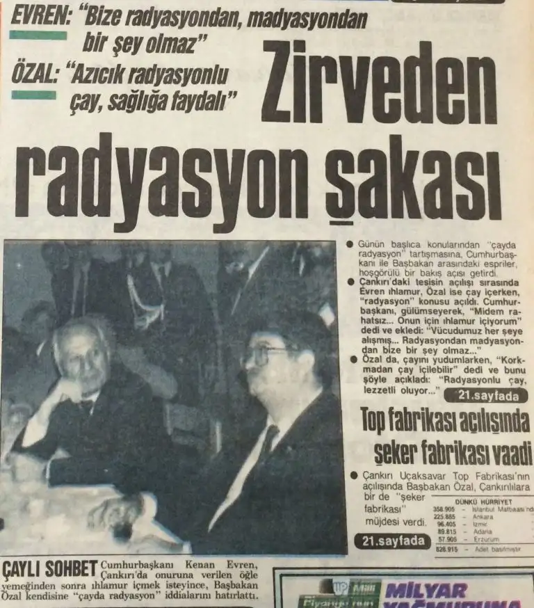 Bu bugünün sorunu da değil, vaktiyle Çernobil patladığında insanlar serpintilerden tek tek kanser olmaya başladığında, yanılmıyorsam ODTÜ’nün bile rapor yayınlamasına rağmen, gayet rahat tvye çıkıp çaylarda bir şey yok bak biz içiyoruz diyerek insanlarla kafa bulduğunu düşündüğüm başka partileri de gördük biz.