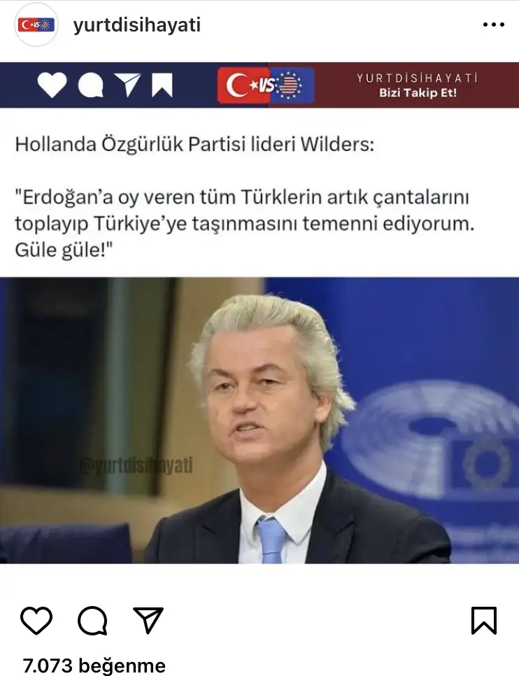 Bu bile ne güzel Bi is yaptığımızın göstergesi..Hollandalı aşırı sağcı lider Erdoğan’a oy veren tüm Türklerin çantalarını toplayıp Türkiye’ye taşınmasını temenni etmiş.Gurbetci olmakta zor. Ne ülkende yaşıyorsun, ne de yaşadığın ülkeye sığıyorsun.