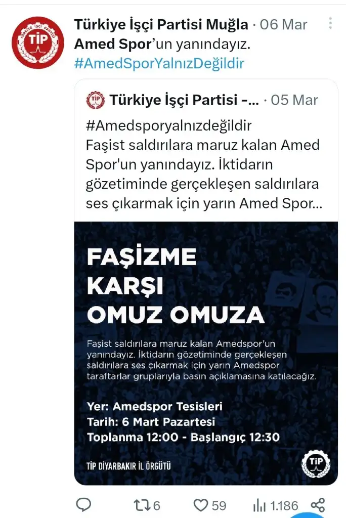 Denemekten kastım Millet İttifakı, TİP in tavrına gelirsek maçta " beyaz toros " larla yapılan faili meçhulleri hatırlatan pankartlar açıldığı için Amedspor a destek verdiğini açıklamış. O pankartların tam da HDP Millet İttifakına destek verebileceğini söyledikten sonra açılmasının tesadüf olduğunu düşünmüyorum.Siyaset yerine futbolu karıştırma ilgisi olanı da denemek ne bileyim. Eki Görüntüle 3217931