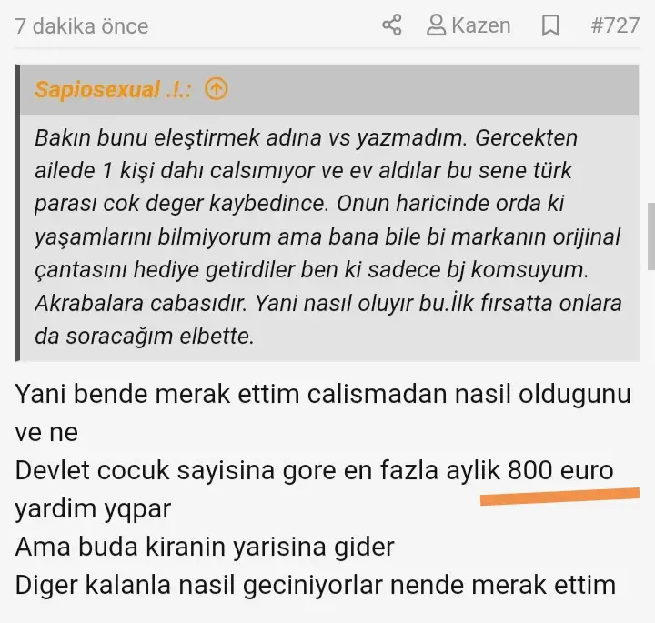 E bak nasıl güzel cevabı verdıniz. Orada asgari ücret 1200 euro cocuk yardımı 800 euro. Yani coxugun bakımını bi nevi devlet üstlenmiş hatta ikinci cocukta kirayı da karsılarsınız tamamdır.Yani bende merak ettim calismadan nasil oldugunu ve ne