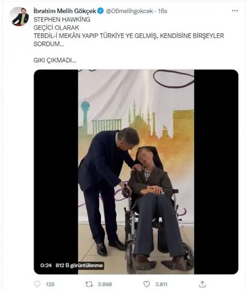 O ayrı bir vaka...İncelenmesi lazım Türk doktorları tarafından çok ciddiyim.Bedensel engel bir şey değil, ya tekerlekli sandalyeye bağlı bir hayat sürmüş Stephen Hawking heykeliyle bu şekilde dalga geçen Melih Gökçek gibi olsaydık?