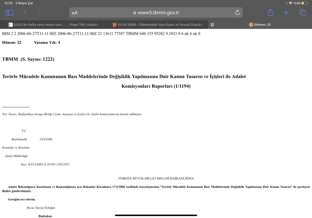 Örneğin “Terörle Mücadele Kanununun Bazı Maddelerinde Değişiklik Yapılmasına Dair Kanun Tasarısı. 21 Nisan 2006 tarih ve 1/1194 numara ile Başbakan Erdoğan ve Bakanlar Kurulu üyelerinin imzalarıyla Meclis Başkanlığı’na gönderilen tasarı” hakkında TBMM tutanakları.